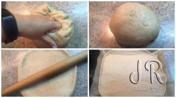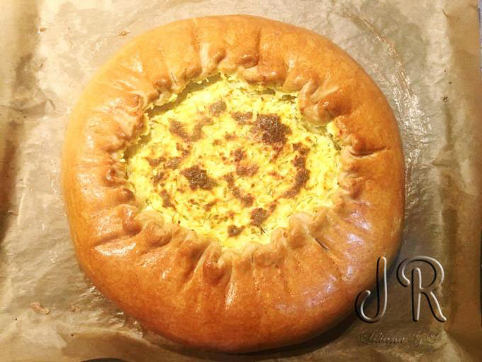 Apoi, transferam amestecul pe foaia de aluat si ii dam o forma rotunda.