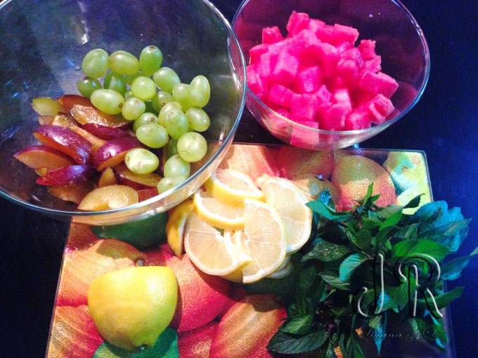 Pepenele rosu se curata de samburi si se taie cuburi. Prunele la fel se curata de samburi si se taie felii. Strugurele se spala si se aleg doar bobitele.
