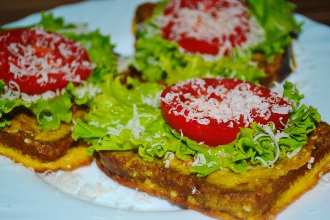 Imuiem felia de paine pe ambele parti in ou cu parmezan si o prajim in tigaie incinsa cu ulei, pana capata o crusta rumena.