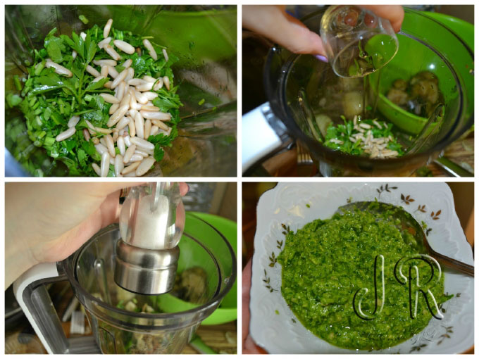 Mixam intr-un blender patrunjelul, semintele de pin, usturoiul si uleiul, pana obtinem un sos fin asemantor cu smantana.