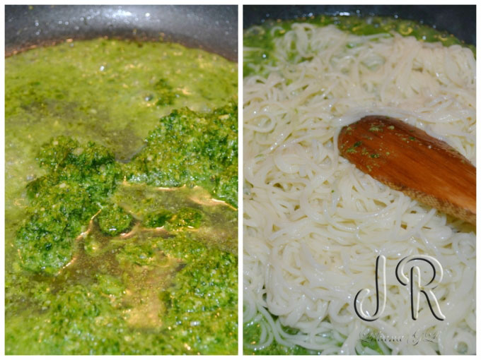 Sosul obtinut il punem intr-o tigaie, adaugam 200 ml de apa si lasam sa fiarba 1 minut, apoi adaugam pastele fierte, lasam sa mai fiarba pana scade apa.