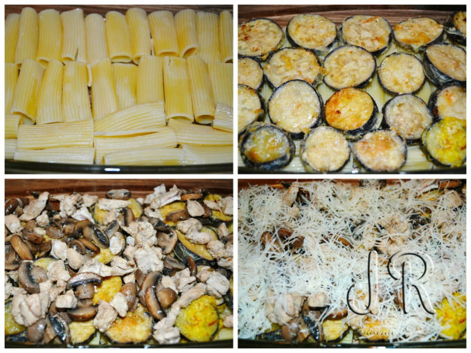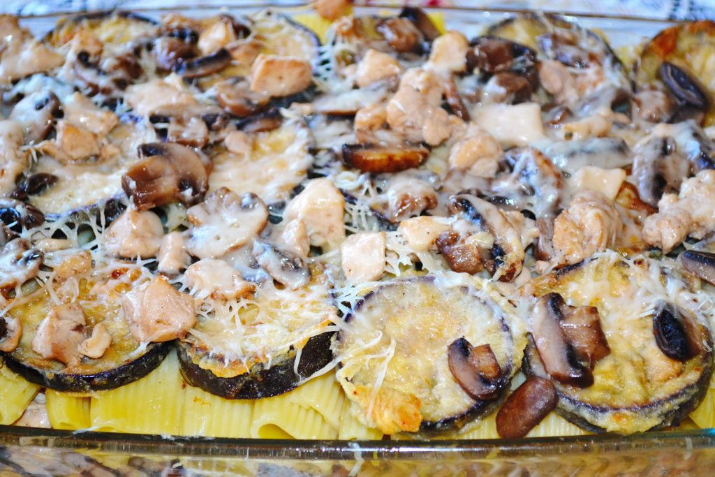 Penne cu vânătă, ciuperci și piept de pui
