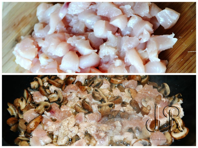 Cand ciupercile erau aproape gata, am adaugat pieptul de pui tocat cubulete, am asezonat cu sare si piper.