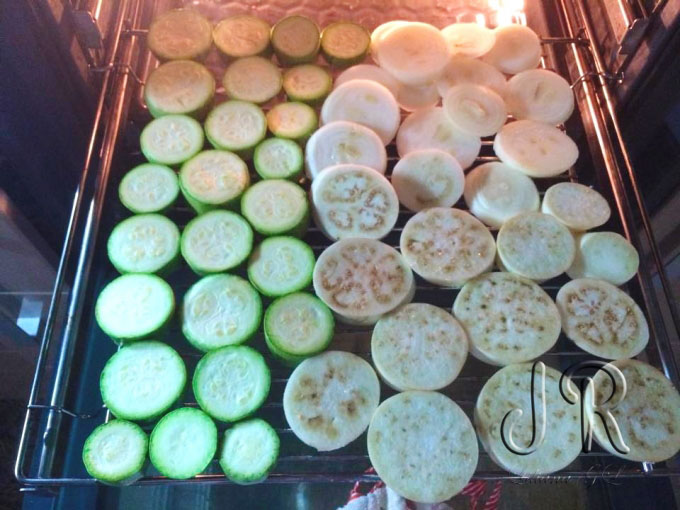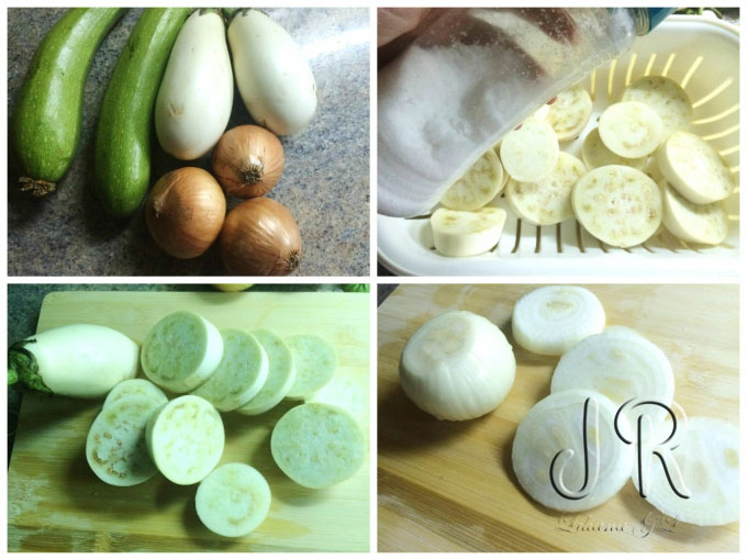 Cu 1 ora inainte de cina coacem legumele pentru garnitura. Dovleceii ii taiem rondele de aproximativ 1 cm, ceapa la fel.