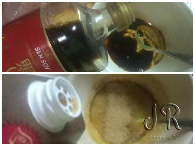 Pieptul de pui il marinam cu o seara inainte. Marinada o preparam dintr-o lingura de sos de soia, una de zahar brun si doua de mustar.