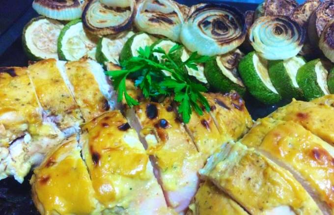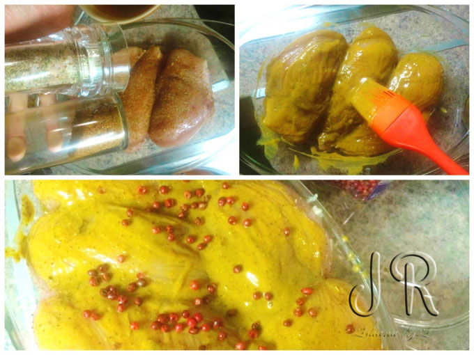 Pieptul de pui il asezam untr-un vas, il saram, il condimentam cu mixul de condimente orientale si ungem cu marinada de mustar.