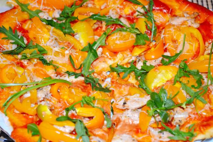 Pizza cu piept de pui marinat, mozzarella și frunze de rucola