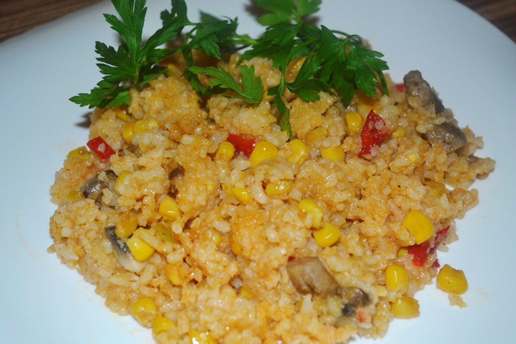2 cani de orez, 2 linguri de ulei de masline, 300g ciuperci, 1 ceapa, porumb, 1 ardei (eu am folosit congelat), 1 lingura boia de ardei, sare si piper.