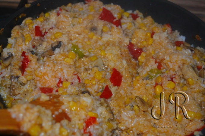 Cu mare grija combinam orezul cu amestecul din tigaie, apoi retragem de pe foc si lasam sub capac 5-10 minute.