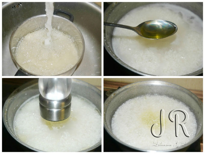 Spalam orezul sub un jet mare de apa, apoi il punem intr-un vas cu apa rece si il lasam deoparte pentru 10 minute. Scurgem orezul de apa si il punem la foc intr-un ceaun, la 1 cana de orez adaugam 2 cani de apa.