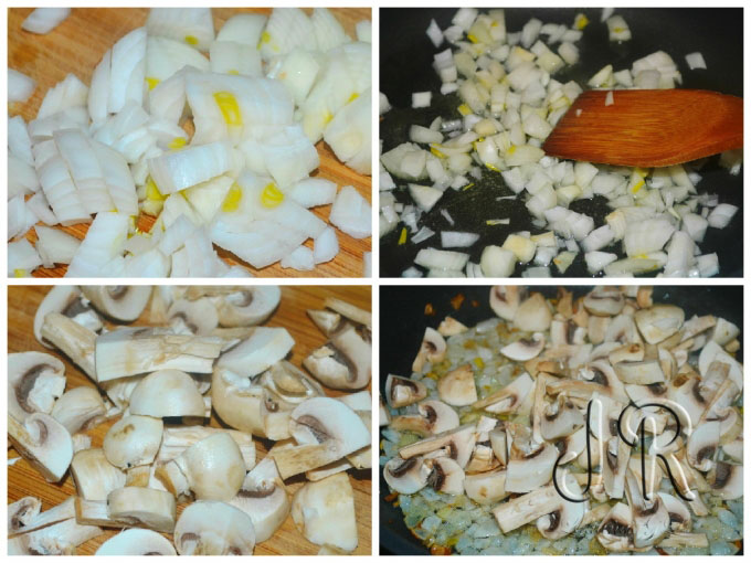 Intre timp, intr-o tigaie incinsa cu ulei calim ceapa tocata marunt, apoi adaugam ciupercile taiate mai mascat.