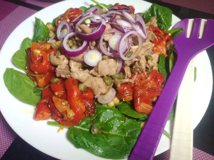 o cutie de spanac proaspat; o cana de naut fiert; 6-8 ardei capia; o conserva de ficat de cod o ceapa rosie; o mana de capere; otet balsamic de Modena; sare; busuioc uscat.