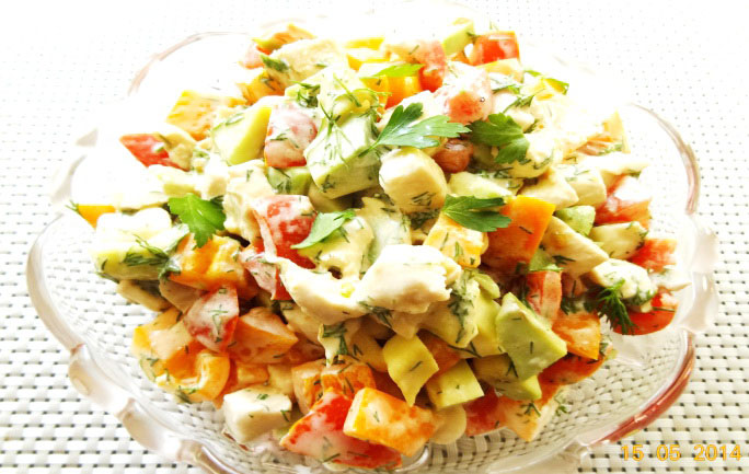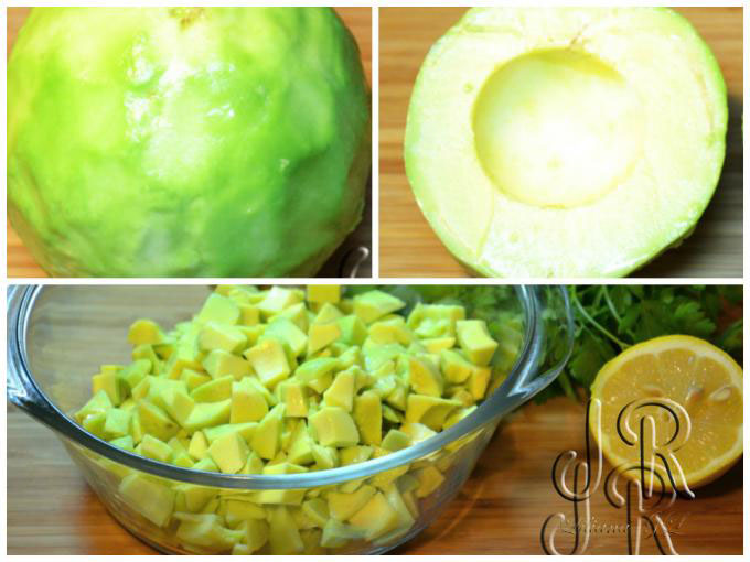Avocado se curata de coaja, se indeparteaza samburile si se taie cubulete. Nu uitam sa stropim pulpa de avocado cu zeama de lamaie pentru a nu se oxida.