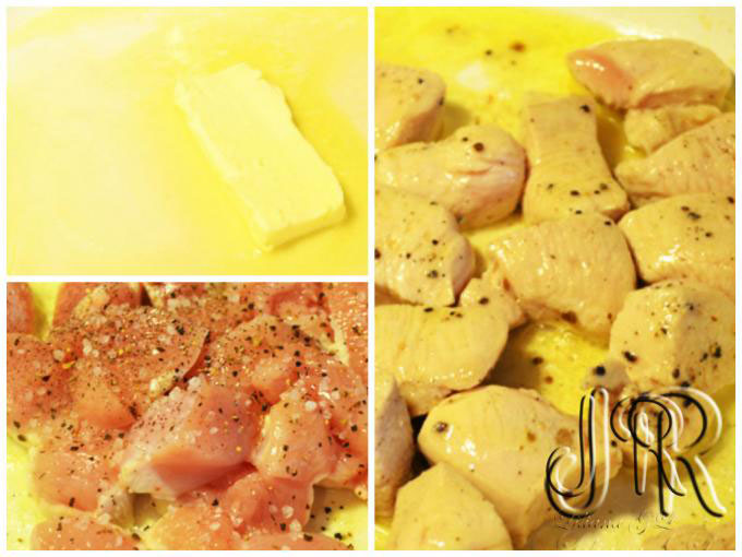 Pieptul de pui se taie cubulete, se asezoneaza cu sare, piper si se gateste intr-o tigaie incinsa cu cateva picaturi de ulei si o felie de unt, timp de 2-4 minute la foc moderat spre mare.