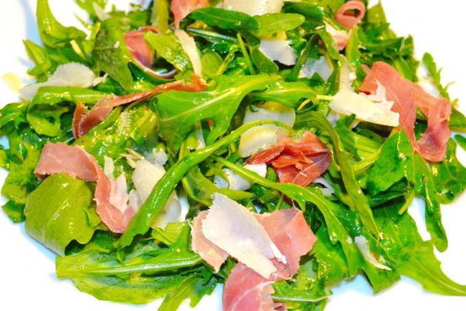Dar eu nu m-am oprit aici, asa ca am incercat sa combin salata si cu o felie de prosciutto, rupta in feliute mai mici.