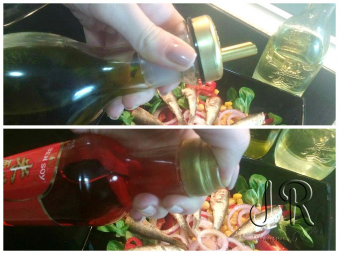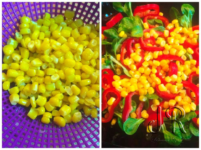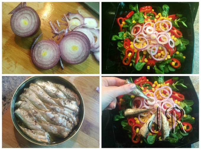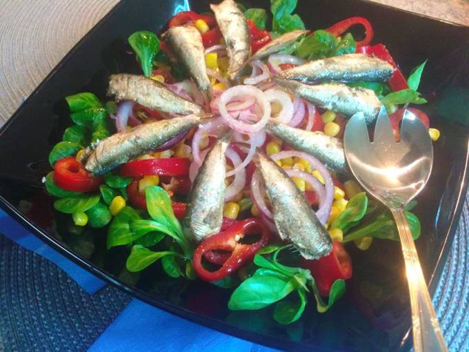 o punga de buchetele de valeriana; 2 ardei capia; 1/3 borcan de porumb dulce conservat; 1/2 conserva de sprote de Riga in ulei; 1/2 ceapa rosie; sare; ulei de masline extravirgin; otet rosu de orez.