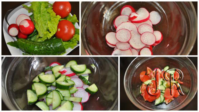 Ridichea se taie rondele, castravetele si rosia bucati mai mici.