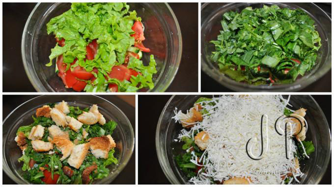 Frunzele de salata, rucola si cele de spanac se spala, se lasa sa se usuce si se rup cu mainile.