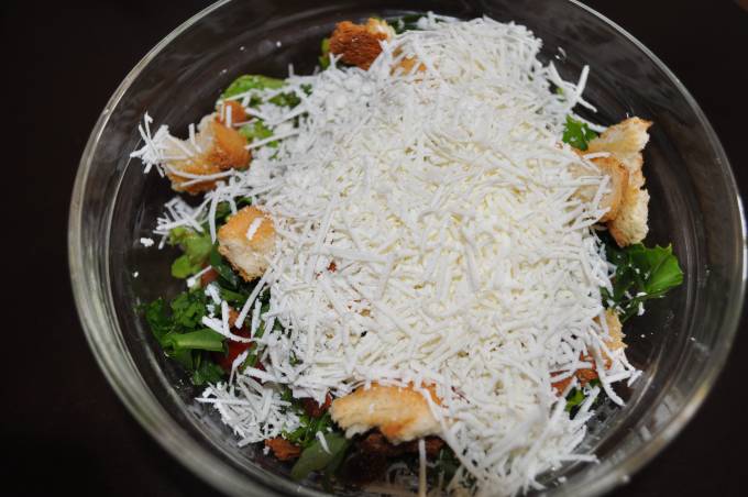 Faramam pesmetii in bucati, iar deasupra razuim branza de oi.