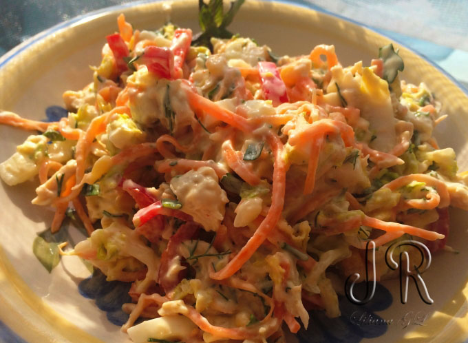 Intr-un vas adanc se combina toate ingredientele, se adauga maioneza si se amesteca cu grija.