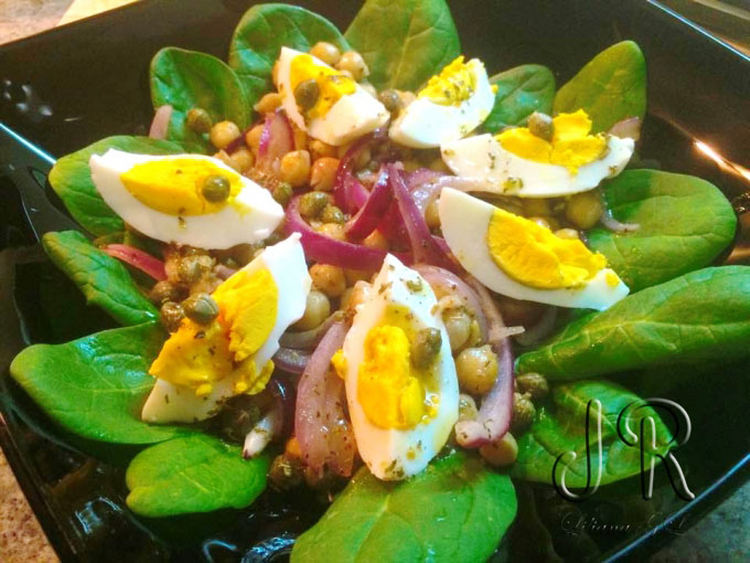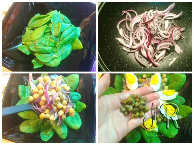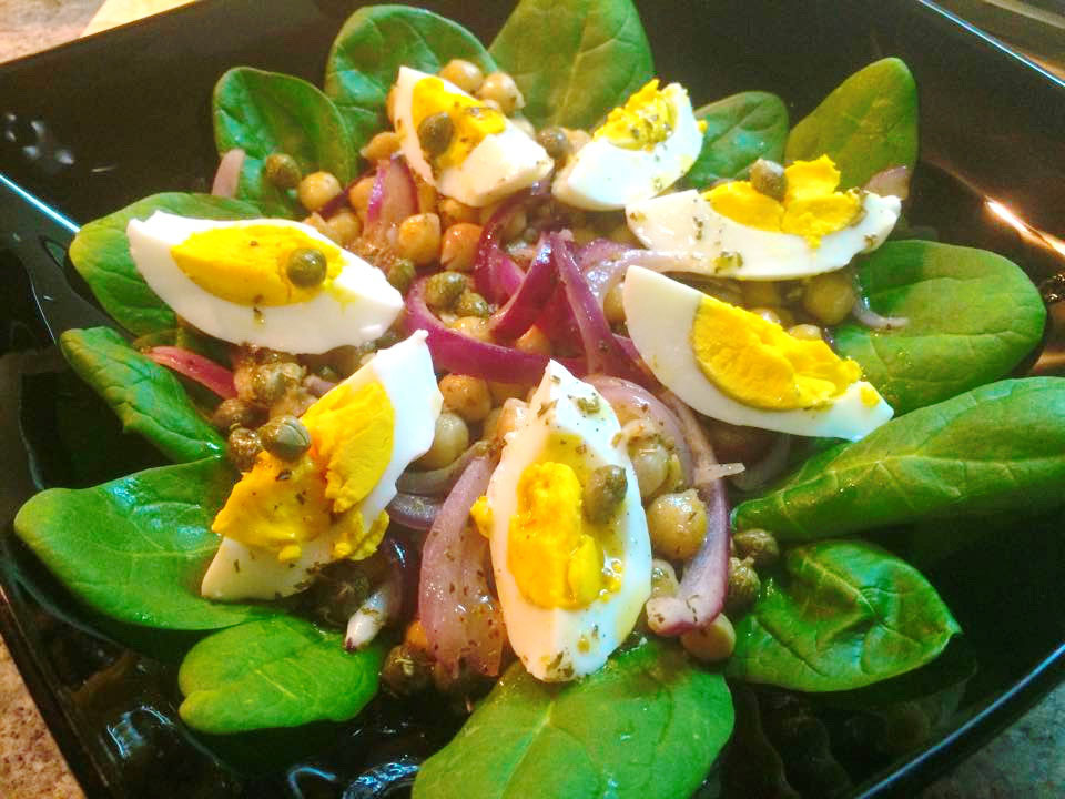 200 gr naut, o legatura de spanac; o ceapa rosie; doua oua fierte tare; o lingurita de capere; 1-2 catei de usturoi (optional); 3 linguri de ulei de masline; 2 linguri suc de lamaie; sare cu plante aromate; piper negru.