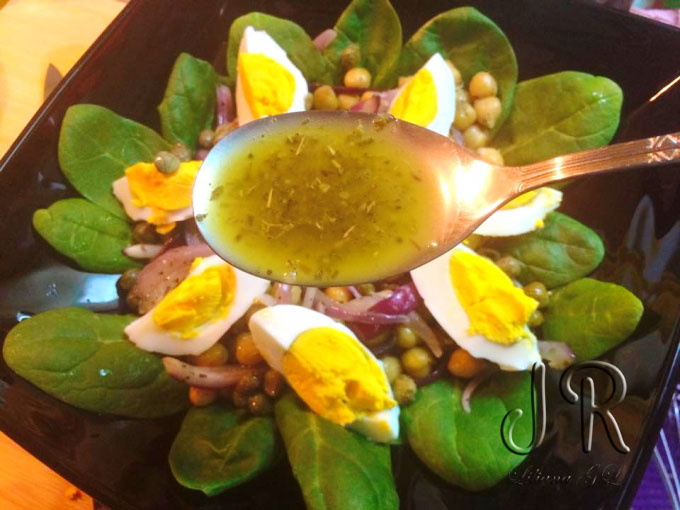 Acestei salate simple i se potriveste si un dressing clasic din ulei de masline, suc de lamaie, sare cu plante aromate si un pic de piper negru.