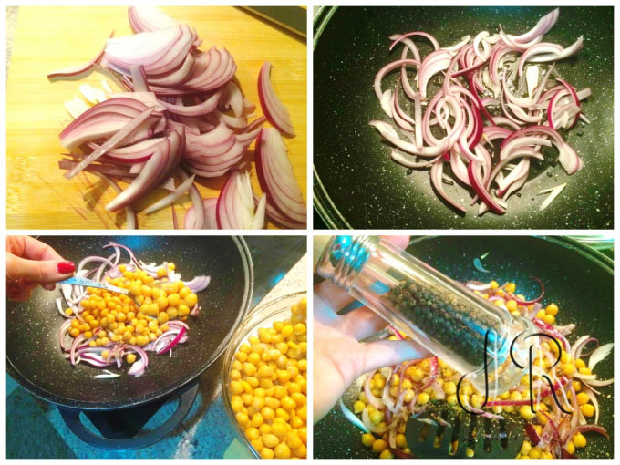 Incingem o tigaie si punem la incalzit nautul, ceapa taiata fasii subtiri, intr-o lingura de ulei.