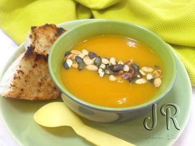 Servim supa stropita cu ulei crud de masline si seminte de dovleac prajite usor pe tigaia uscata.