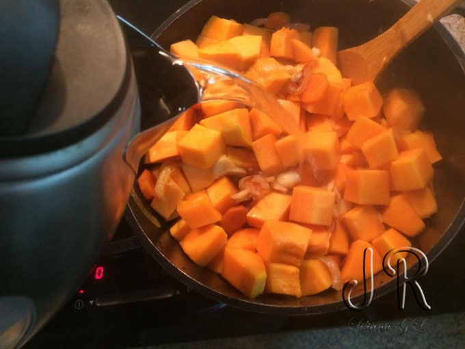 Dupa usturoi vine dovleacul si merele. Completam cu apa fierbine, cat sa acopere toate legumele.