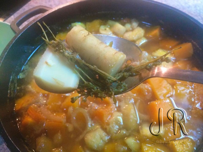 Lasam sa fiarba, pana este gata dovleacul. Apoi "pescuim" bucatile de pastarnac si crengutele de cimbrisor, acestea si-au lasat deja savoarea si aromele in supa.