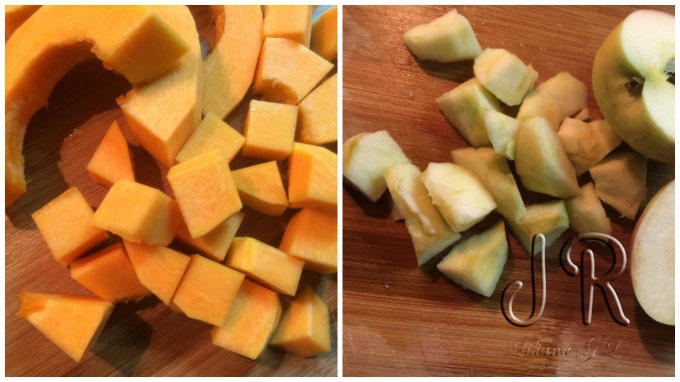 Intre timp, taiem dovleacul si merele curatate cuburi medii.