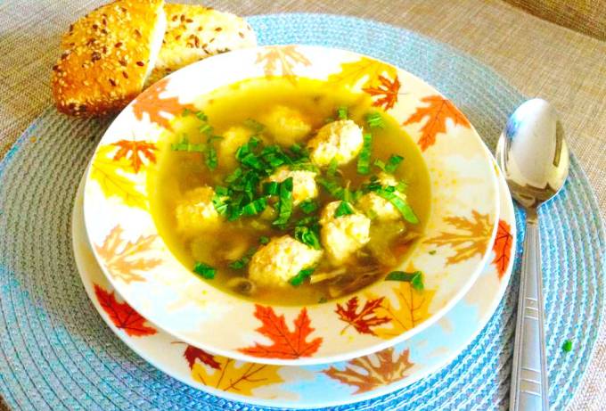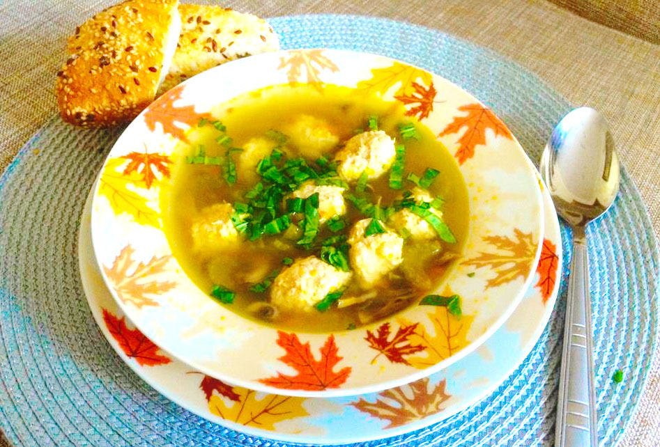 Ciorbă de mazăre cu ciuperci și perișoare de pui