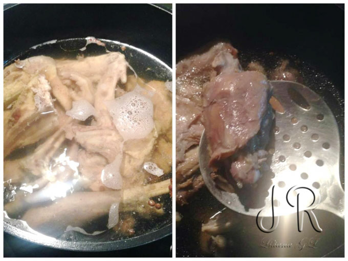 Curcanul îl fierbem ca de obicei pentru ciorbă, cu o ceapă întreagă, o frunză de dafin, sare și câteva boabe de piper (eu am ales roșu). Când este gata carnea,