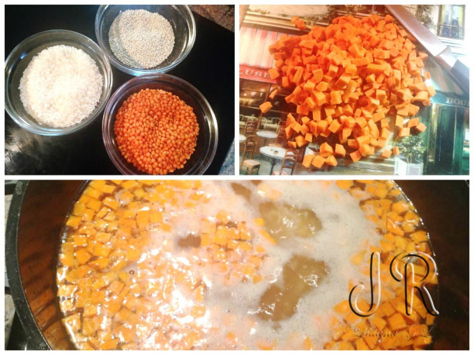 Aducem din nou la fierbere zeama de curcan și pregătim crupele. Orezul, lintea și quinoa le spălam fiecare aparte și le punem la fiert în bulion.
