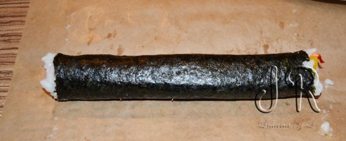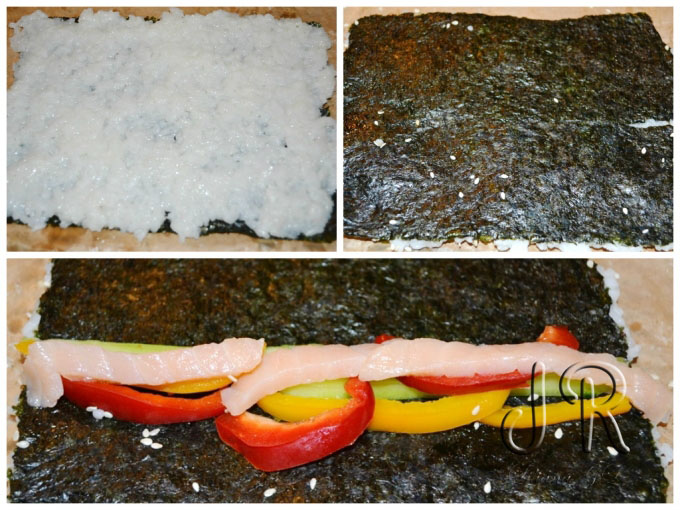 Punem pe foaie un strat subtire de orez, il intindem cu mainile umede, lasand o margine libera, cam de 2 cm la un capat. Stratul trebuie sa fie uniform ca si grosime.