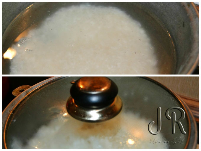 Spalam orezul sub un jet mare de apa, pana ramane apa curata. Il punem la fiert intr-o cratita ( eu am folosit un ceaun), dupa ce a dat in clocot il fierbem 2 minute la foc tare, apoi 10 minute la foc incet, condimentam cu sare si piper, dupa gust. Se scoate de pe foc si se lasa orezul sub capac, timp de 10 minute.