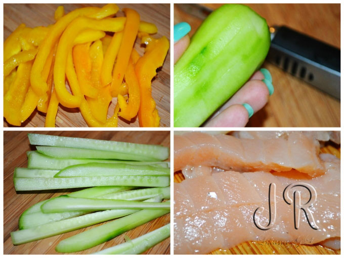 Intre timp, somonul se taie fasii, iar castravetele si ardeiul se taie pai.