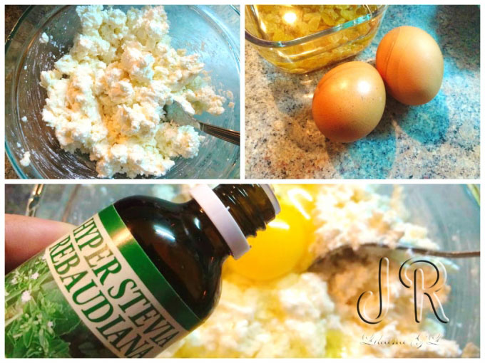 Intr-un bol combinam branza, ouale si zaharul ( eu l-am inlocuit cu indulcitor natural de stevie ), amestecam pana obtinem o pasta omogena.