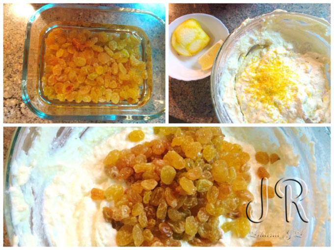 Stafidele le hidratam 30-40 minute in apa calda, apoi le scurgem si le adaugam in branza impreuna cu coaja rasa de lamaie, amestecam.
