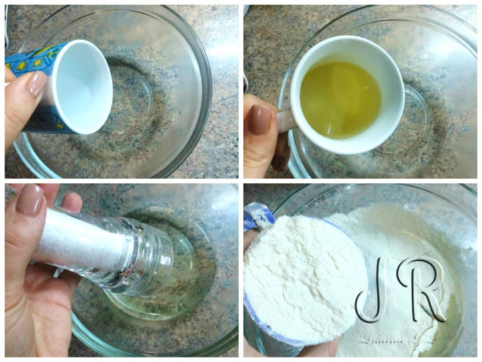 1/2 cana de ulei, 1/2 cana de apa clocotita; 2 cani de faina; 1/2 lingurita de sare.
