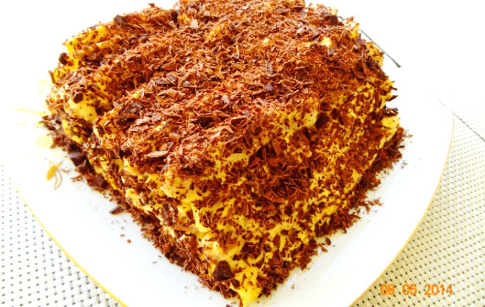 Tortul se decoreaza cu ciocolata si se da la frigider pentru cel putin 30 minute.