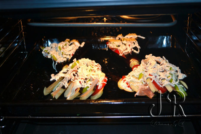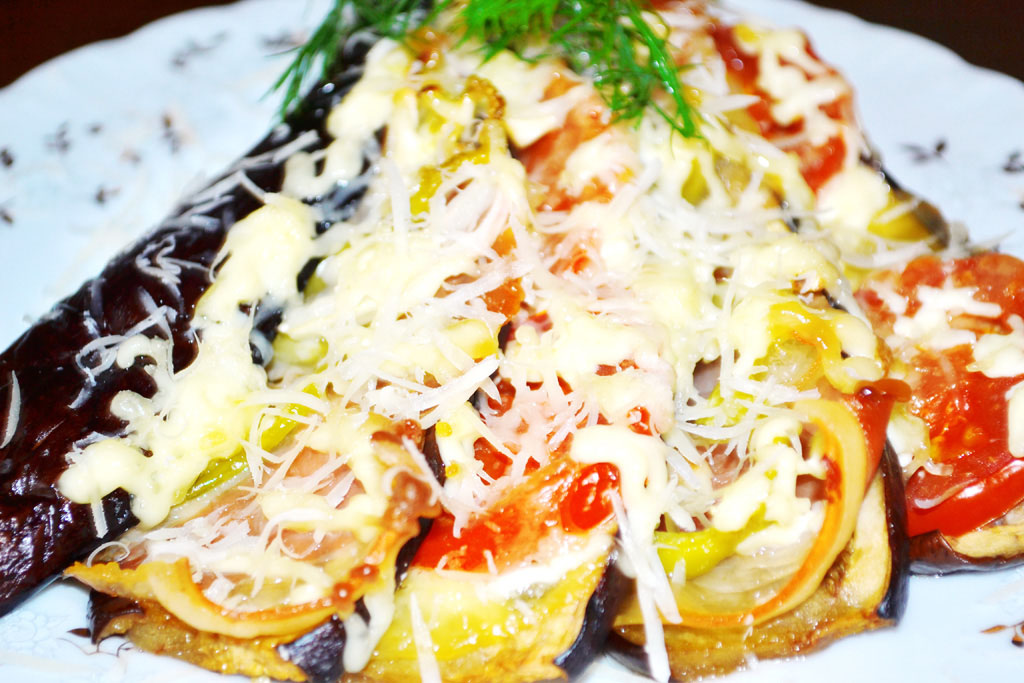 Printre fiecare felie de vanata se aranjeaza felii de rosii, mozzarella, ceapa si ardei. Deasupra se presara usturoiul tocat marunt.