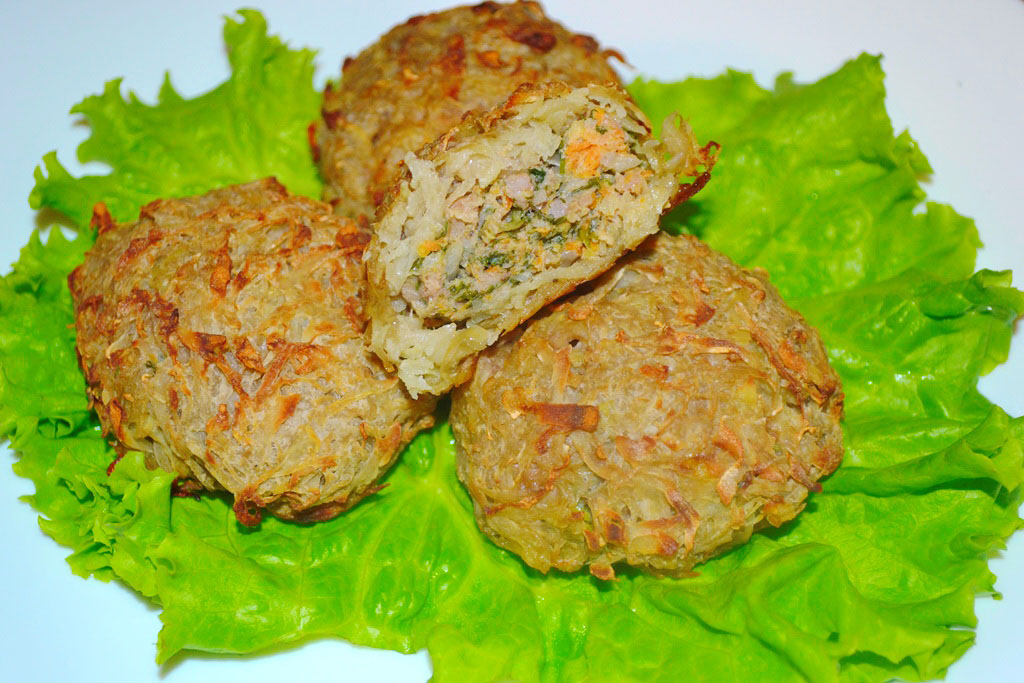 In mana intindem un strat de cartofi razuiti, deasupra adaugam o lingura din amestecul de carne, formam chiftelute si le aranjam pe o tava unsa bine cu ulei.