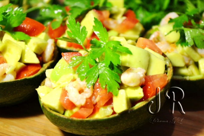Salata obtinuta se aranjeaza frumos in cupele de avocado si poate fi servita.