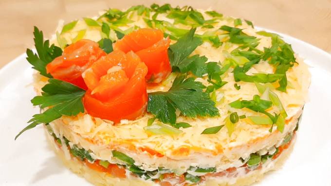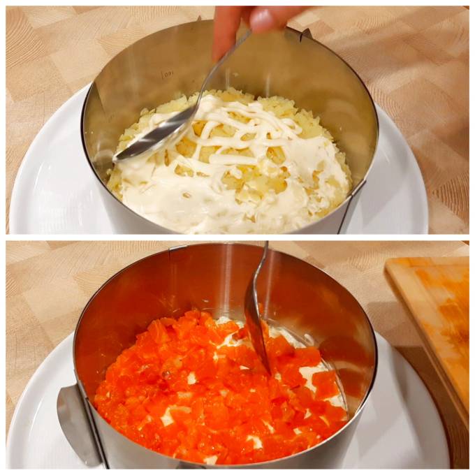 În al doilea strat aranjăm peștele roșu tăiat cubulețe mici.