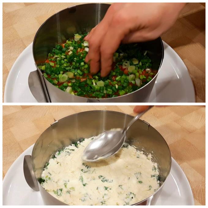 Al treilea strat este ceapa verde tocată fin. Adăugăm 20-30 de grame, dar dacă doriți, puneți mai puțin sau mai mult.