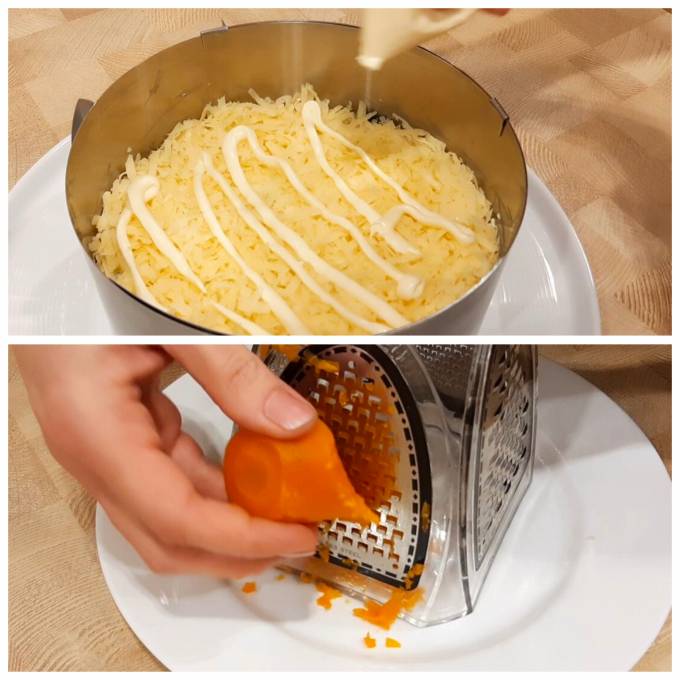 Cașcavalul îl dăm pe răzătoare mășcată și îl aranjăm peste ouă, ungem cu maioneză, iar al șaselea strat sunt morcovii curățiți și răzuiți mășcat.
