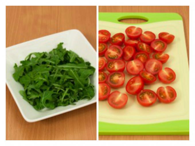 Intre timp, frunzele de salata se spala si se usuca, iar rosiile cherry se taie in doua jumatati.