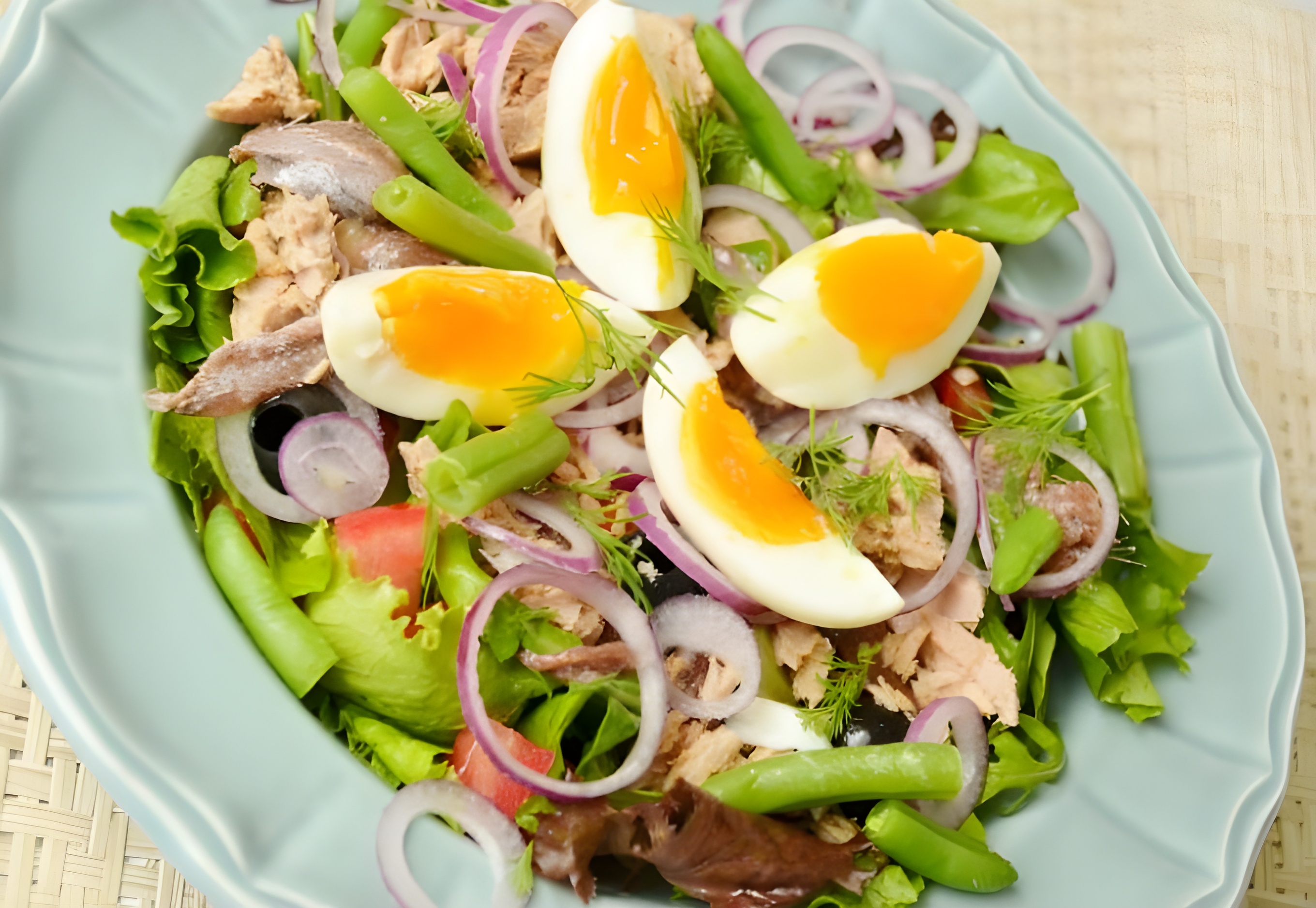 Intr-un bol incapator amesteca uleiul ramas cu otetul, caperele si rosiile. Adauga ceapa, spanacul, tonul si cartofii, amesteca usor. Asezoneaza cu sare si piepr, dupa gust. Deasupra asaza jumatatile de oua.