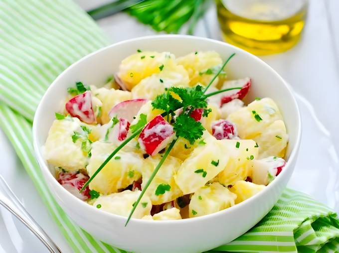 Taie cartofii în cubulețe, la fel ridichile (nu îndepărta coaja, care va da salatei un aspect aparte). Pune totul într-un bol și încorporează maioneza, apoi pătrunjelul tocat mărunt.